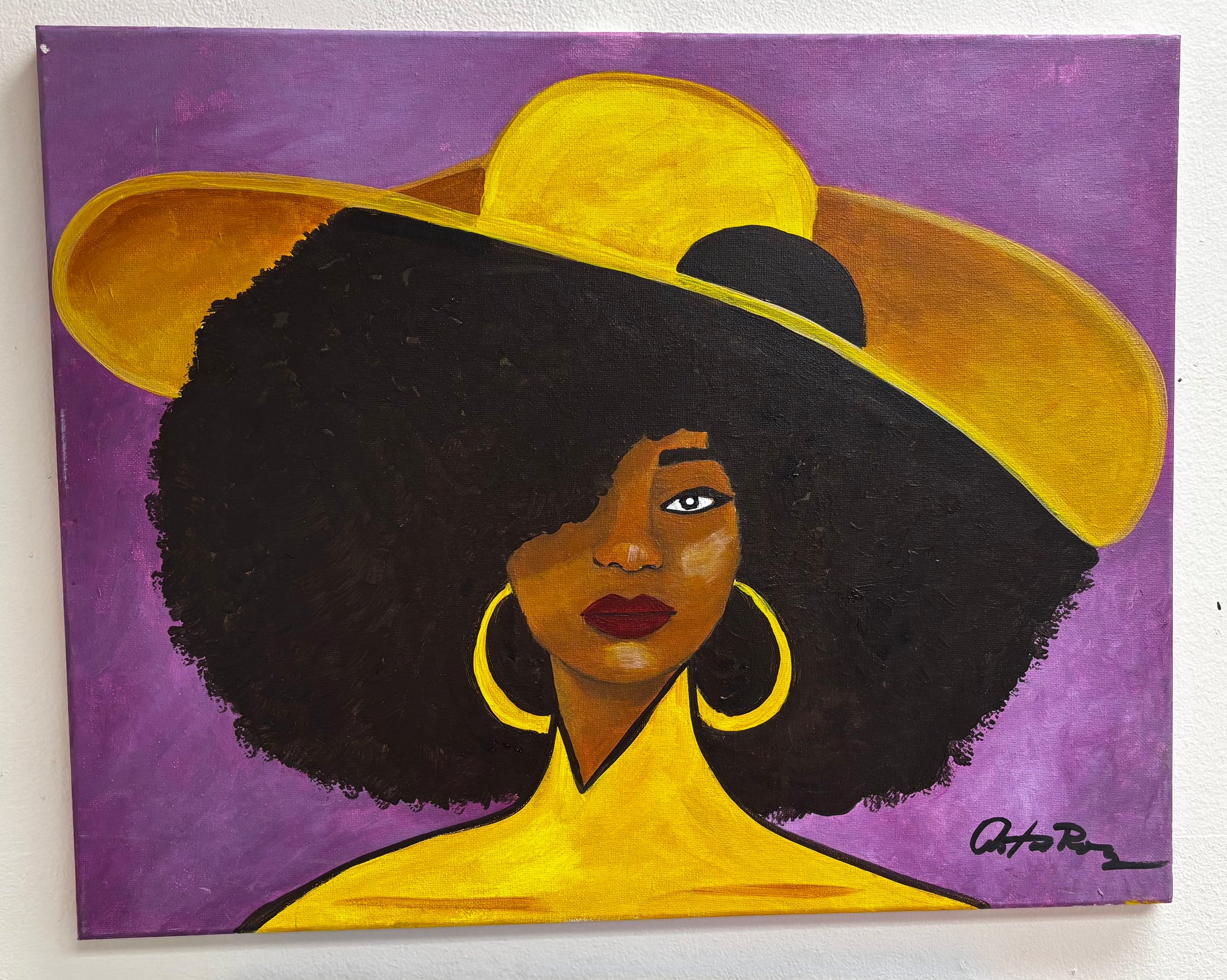 Afro Lady is a bold and vibrant 16x20 artwork celebrating beauty, confidence, and cultural pride, featuring a striking woman in a wide-brimmed hat with radiant golden tones against a deep purple backdrop. Perfect for adding elegance and empowerment to any space, this piece makes a statement of strength and style