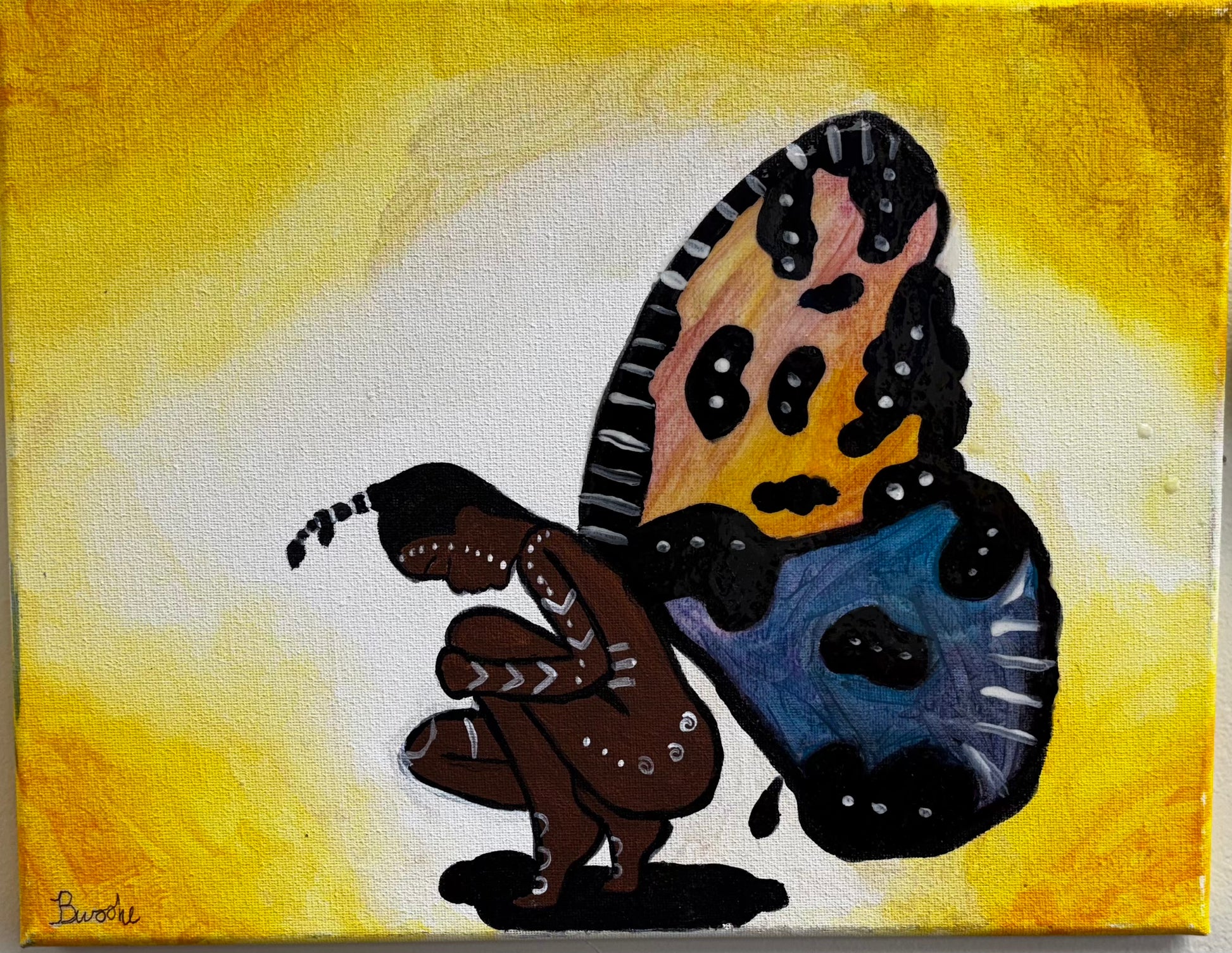 A bold and symbolic 11x14 painting featuring a butterfly with vibrant Wakanda-inspired colors, representing transformation, strength, and cultural pride.